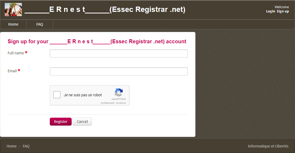 2. Create your access account by entering your first/last name (Full Name) and your email (Email). Validate the security option, then submit by clicking on the "Register" button.