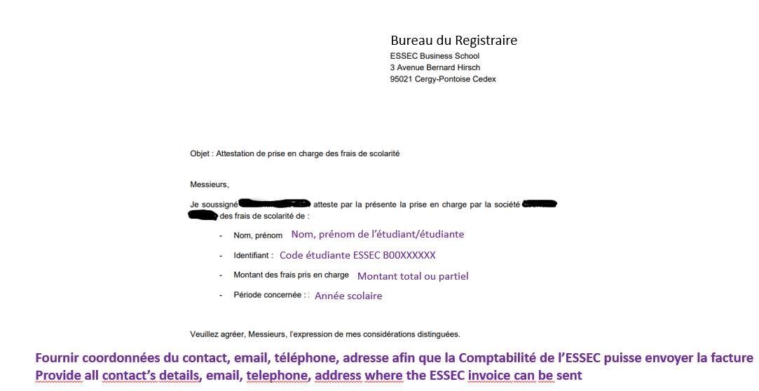 ESSEC Accounting edits a billing note bearing the student's name which is sent directly to the sponsor.