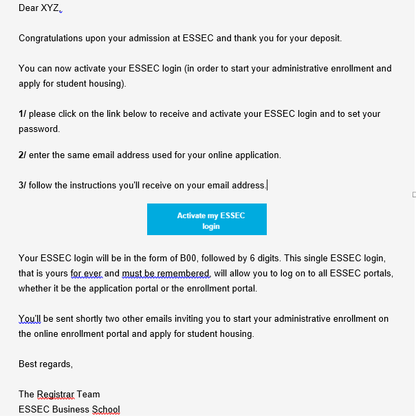 Upon receipt of your deposit, ESSEC IT system generated an identifier or ESSEC code that is unique to you and has permanent validity. From that moment onwards you become a member of ESSEC community. This identifier starts with the letter "B" followed by two zeros and six digits.