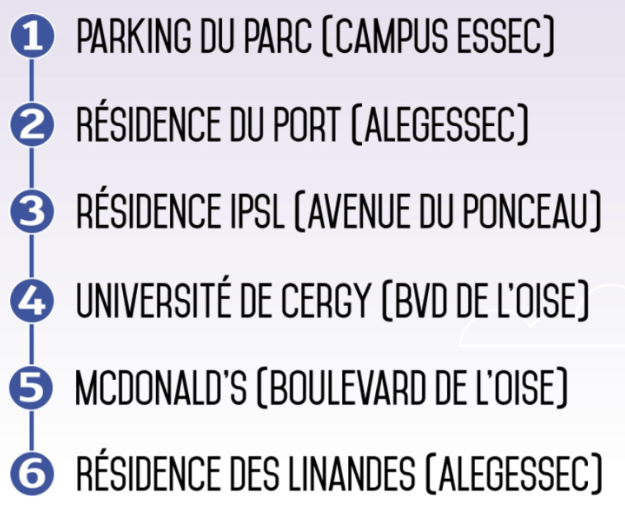 2. ESSEC - Cergy-Préfecture train station (departure just outside by the main entrance at ESSEC):