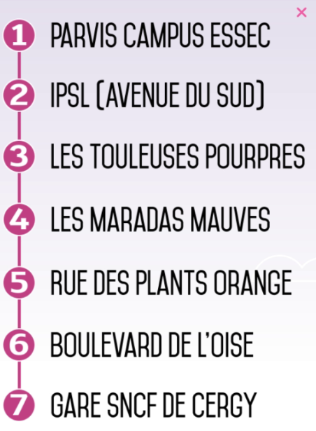1. ESSEC - Cergy-le-Haut residence (departure just outside by the main entrance at ESSEC):